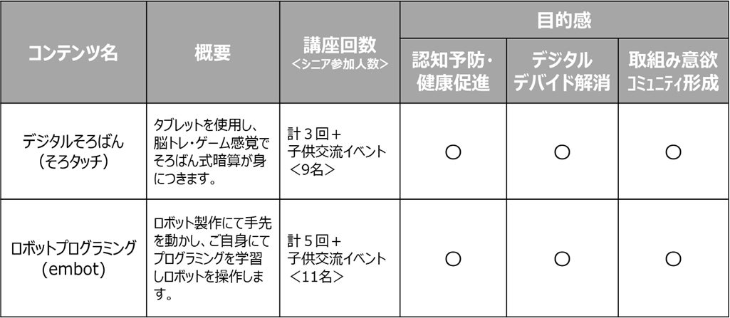 今回のテストマーケティングを通じて得られた結果から、「シニア層に対するICT教材・ツール活用」「子どもに教えることを目標設定したカリキュラム設計」「カリキュラムを通じたコミュニティ形成・交流促進」等の観点から、シニア層に対する当該コンテンツ活用が有効と考え、共通的な地域課題である「高齢化」「デジタルデバイド」等の解決に貢献できるよう、各自治体における地域に根ざしたサスティナブルな取り組みへの展開をめざします。