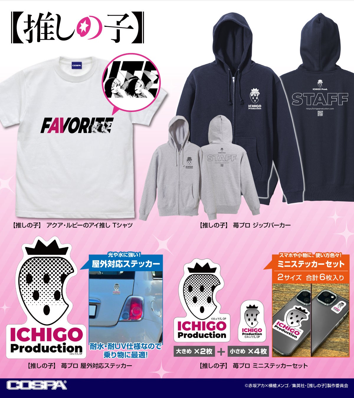 また、「【推しの子】 苺プロ ジップパーカー」「【推しの子】 苺プロ 屋外対応ステッカー」「【推しの子】 苺プロ ミニステッカーセット」は、COPSA(コスパ)も出展する2023年11月26日(日)幕張メッセで開催の 〈【推しの子】苺プロダクション☆ファン感謝祭2023〉にて先行販売も実施予定です。