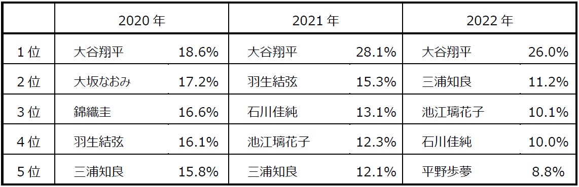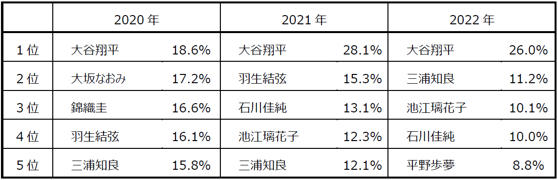 - 好きなスポーツ選手の第1位は米大リーグの大谷翔平選手、2位以下を大きく引き離し5年連続の1位。