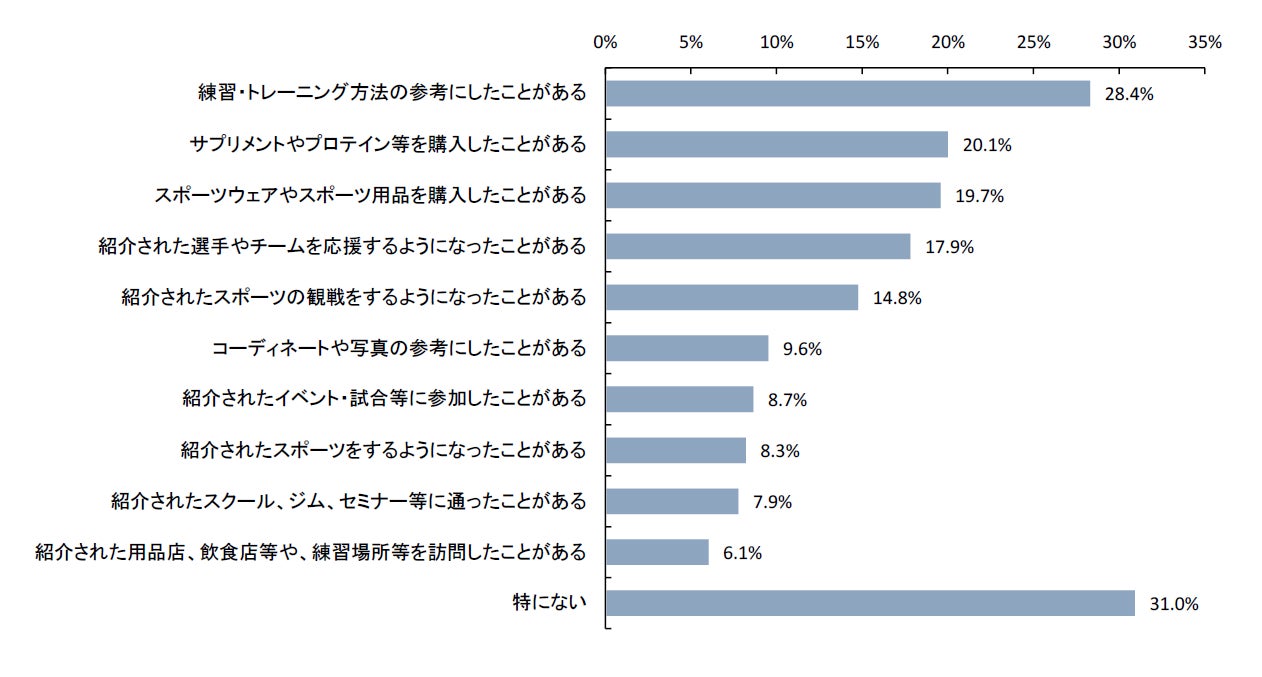 - SNSでスポーツ関連情報を閲覧する人の約2割が、スポーツ関連のインフルエンサーの投稿をチェック。うち、約7割がインフルエンサーの投稿に影響されて何らかの行動をした経験有り。