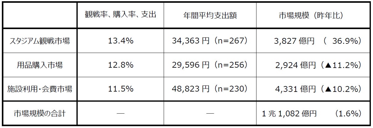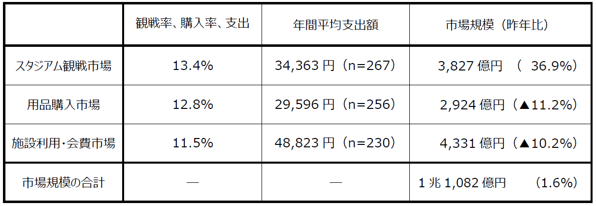 - スポーツ参加市場規模は約1.1兆円でほぼ横ばい、スポーツ観戦市場は昨年比36.9%増と復調。