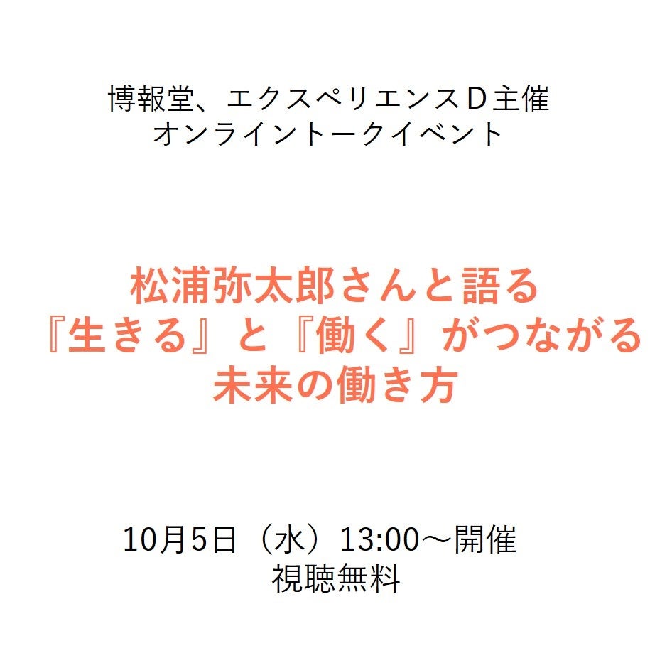 株式会社博報堂(東京都港区、代表取締役社長:水島正幸)と博報堂グループの株式会社エクスペリエンスD(東京都江東区、代表取締役:柴田拡・坂田照雄)は共同で、イノベーションを生み出す人材・チームづくりをテーマにしたトークイベント「松浦弥太郎さんと語る『生きる』と『働く』がつながる未来の働き方」を10月5日(水)に開催します。本イベントは、エクスペリエンスDが運営する鎌倉のカフェ・ワークプレイス「ANOTHER DAY KAMAKURA」にて実施、オンラインで配信いたします。