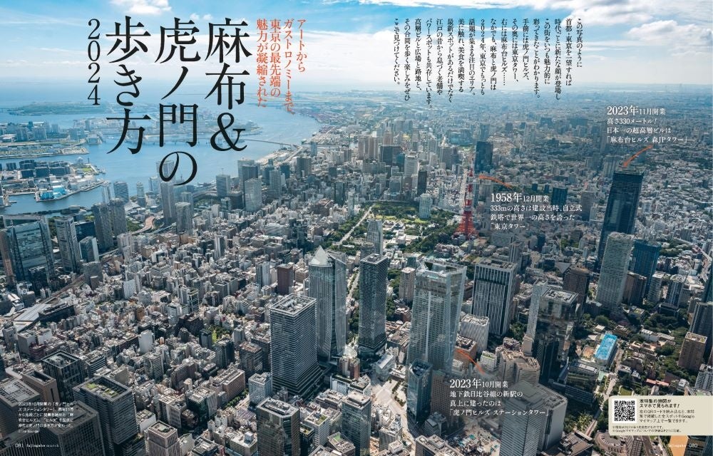 首都・東京を一望すれば、時代ごとに新たな顔が登場し、この街をいつも魅力的に彩ってきたことがわかります。なかでも、麻布と虎ノ門は、2024年、東京でもっとも話題が集まる注目のエリア。美に触れ、美食を満喫する最新スポットがあるだけでなく江戸の昔から息づく老舗やパワースポットも共存しています。高層ビルと広場と路地と、その合間を歩く楽しみをご紹介します。