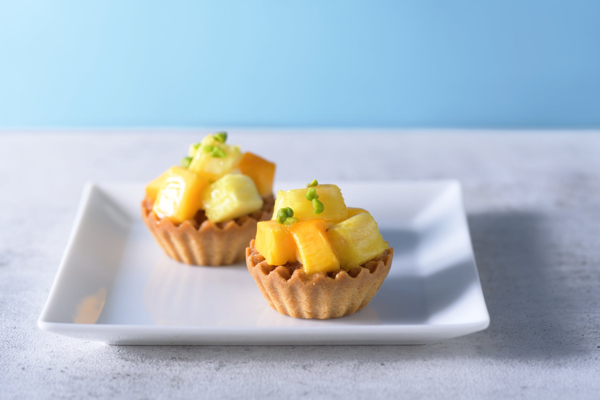 マンゴーとパイナップルの特徴的な甘味と、カルダモンのスパイシーな香りのアクセントを加えタルトに。