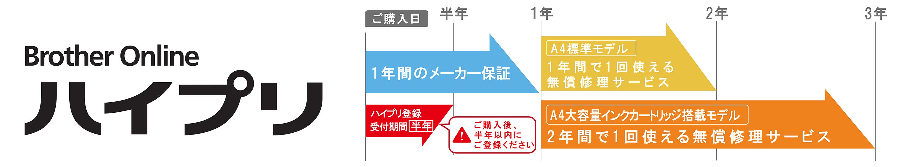 ブラザーオンライン「ハイプリ」に登録することで、1年間のメーカー保証期間に加えて、ブラザー独自の延長保証サービス【※6】が無償で受けられる。標準モデルも新たにハイプリの対象になった。