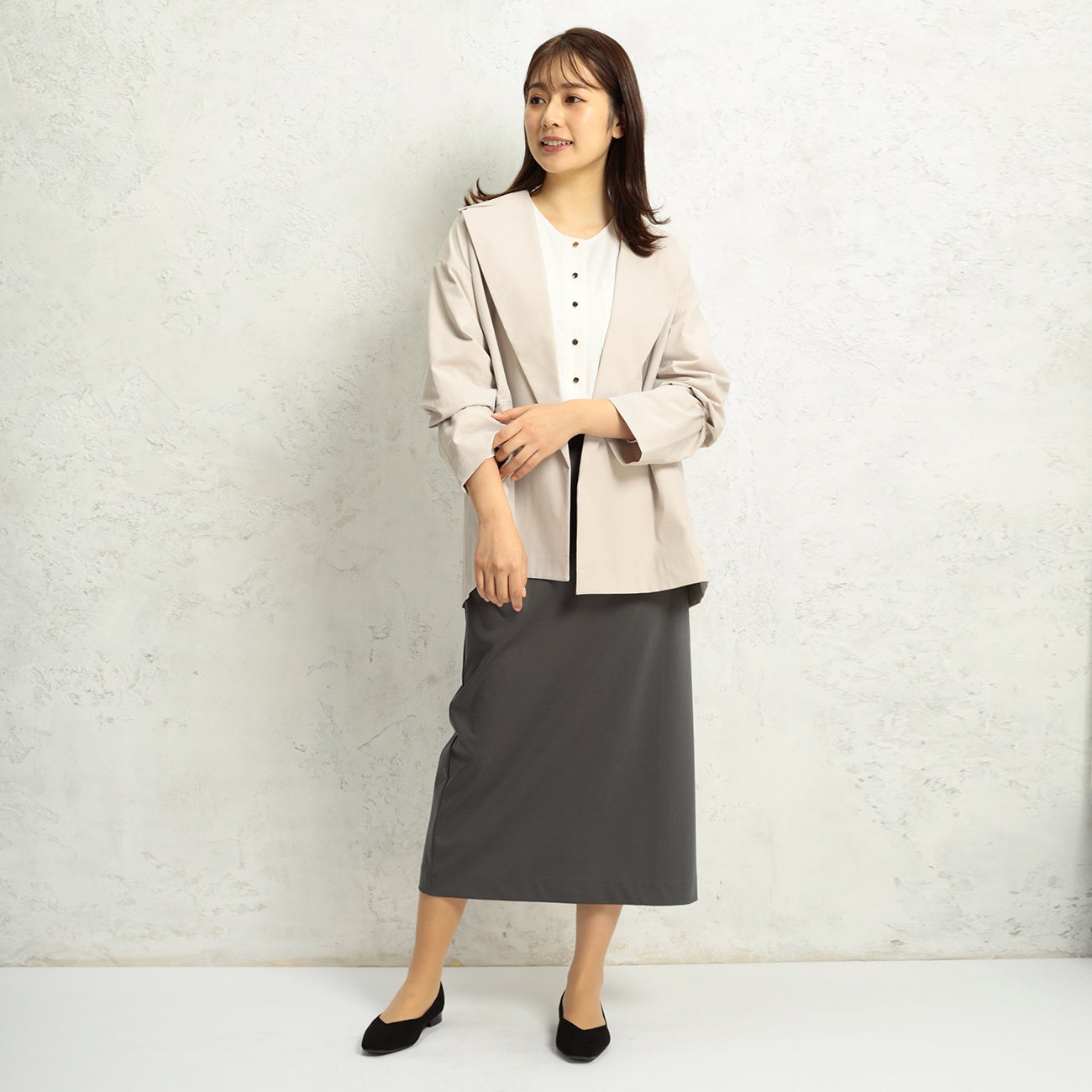 今回はレディースパジャマスーツ®に合わせやすい単品アイテムの展開です。パジャマスーツ®をはじめ、お手持ちのカジュアルアイテムとの相性がよく、ONでもOFFでも幅広く着まわせるアイテムを多数ご用意。ジャージー素材のロングスカートは、「リラックス感」がありながら、レーヨン混生地ならではのドレープ感で上品さと「きちんと感」がある一着です。ミドル丈のオーバーコートは、一枚仕立てでさらっと羽織るのに適しており、これからの時期に活躍間違いなしです。「衿抜き」で着用することで一気にこなれた印象を演出できます。前身ギャザーハイネックブラウスは、ハイネックギャザーにすることで「きちんと感」がありながら、全体のゆったりしたシルエットは「リラックス感」があり、お仕事中もストレスフリーにご着用いただけます。タックデザインカットソーは、オーバーサイズで、ゆったりと着用することができます。袖丈は、二の腕の気になる部分が隠れる長さのフレンチスリーブで、さらに脇下部分も下着が見えにくいマチ付きとなっているため、女性に嬉しい安心デザインです。