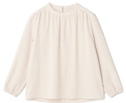 袖口はゴム仕様になっているため、手首が見えすっきりした印象です。全体のシルエットはゆったりしたデザインで「リラックス感」がありながら、首元のギャザーとハイネックデザインは「きちんと感」があり、ご自宅でもお仕事もお召いただけるデザインです。