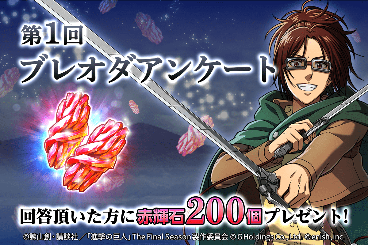 株式会社enish(本社:東京都港区、代表取締役社長:安徳 孝平、以下enish)は、アニメ『進撃の巨人』のスマートフォンゲーム最新作「進撃の巨人Brave Order」にて、新イベント「平和になった暁に」を開催!イベントアイテムの「イアリング」と「ティアラ」を集めて豪華報酬をGETしよう!また、本日より新登場の【ウエディング】ミカサ・アッカーマン、【ウエディング】クリスタ・レンズ、【ウエディング】ペトラ・ラルがピックアップされた「平和になった暁にガチャ」も同時開催!さらに、回答すると赤輝石がもらえちゃう、第1回ブレオダアンケートや生放送のアンケート企画で決定した特別なログインボーナスも実施!その他、最新情報はゲーム公式サイト・ゲーム公式Twitterアカウントにて随時公開して行きますので、ぜひご覧ください。