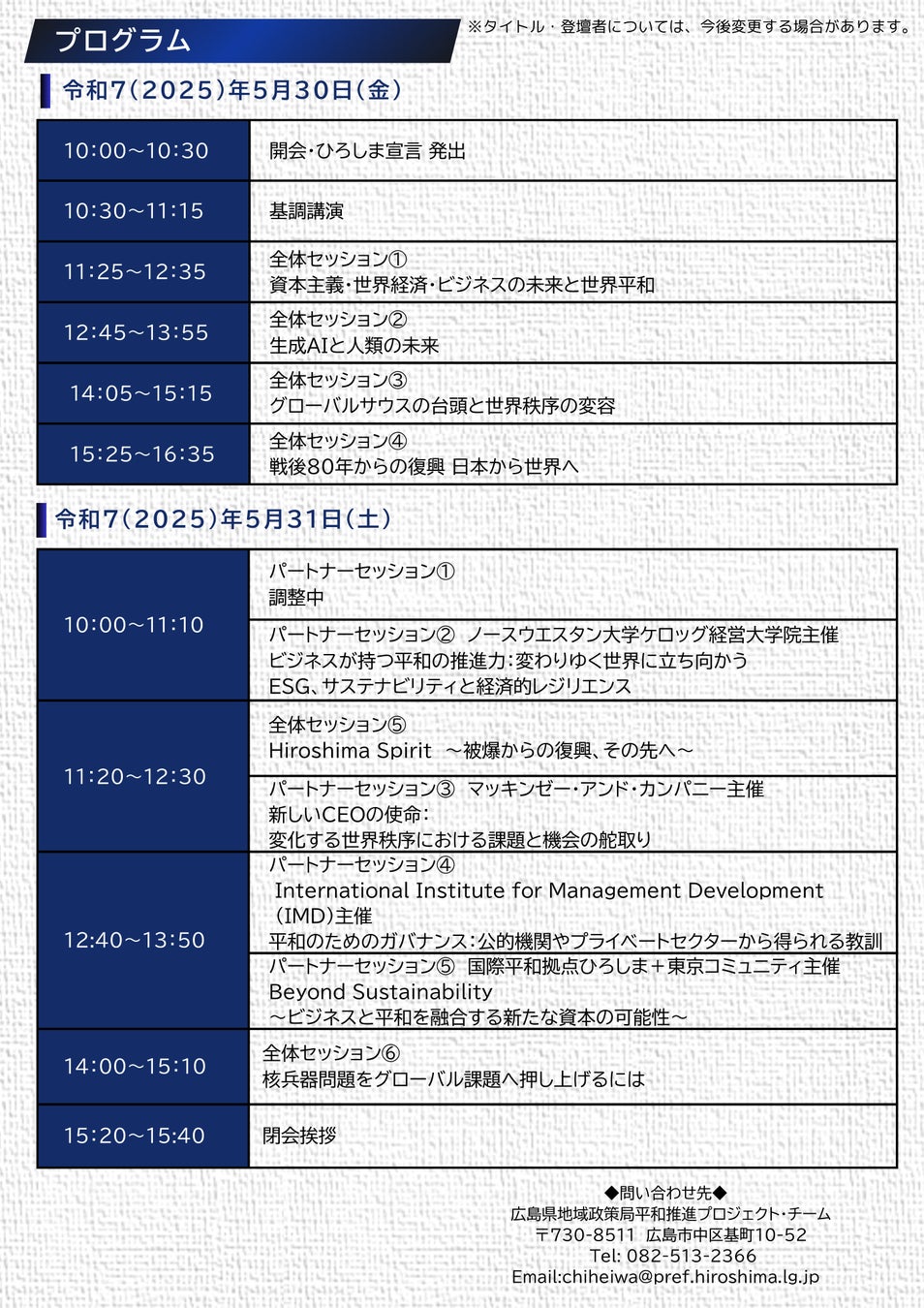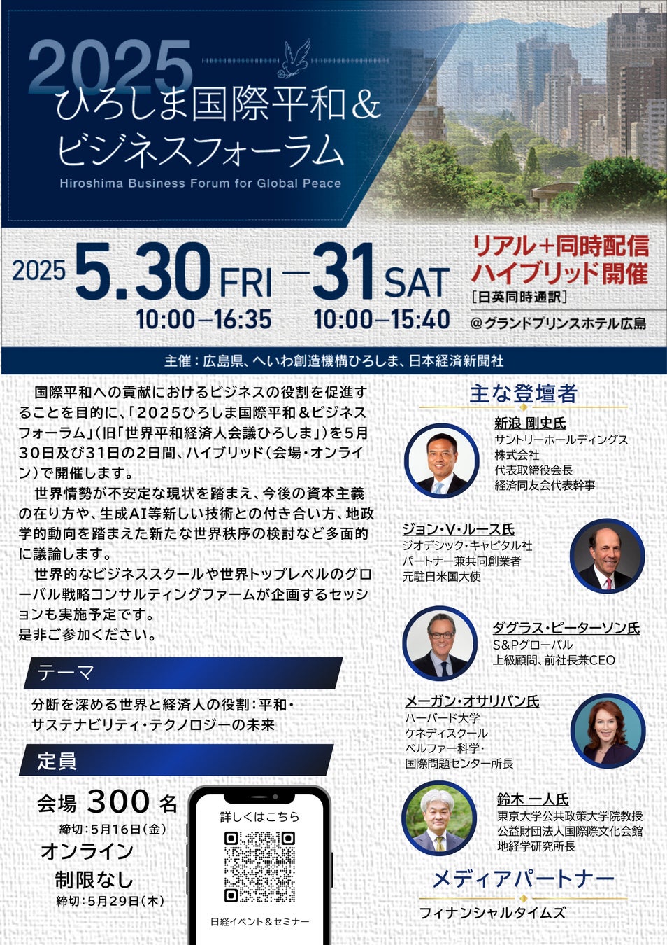 国際平和への貢献におけるビジネスの役割を促進することを目的に、「2025ひろしま国際平和&ビジネスフォーラム」(旧「世界平和経済人会議ひろしま」)を5月30日及び31日の2日間、ハイブリッド(会場・オンライン)で開催します。