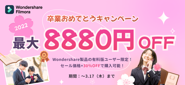 世界150か国以上で利用されるソフトウェアを手掛ける、株式会社ワンダーシェアーソフトウェア(東京都千代田区、代表:呉太兵)は、手軽にクオリティの高い動画が作れるPC向け動画編集ソフトWondershare Filmora(ワンダーシェアーフィモーラ)シリーズが、2021年2月25日(金)~2022年3月17日(木)まで、最大8,880円OFFになる卒業おめでとうキャンペーンを実施いたします。またワンダーシェアー製品有料版ユーザーの方は対象製品をキャンペーン価格からさらに30%OFFでお買い求めいただけます。この機会にワンダーシェアー製品をぜひお試しください。