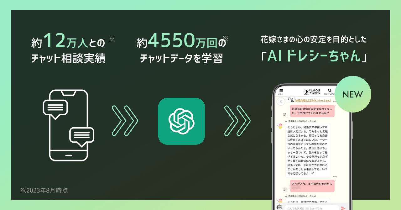 対話型(チャットUI)の情報メディアにこだわり続けてきたプラコレが、 過去7年の4550万件分のチャット相談ノウハウを元に最新技術であるchatGPT(オープンAI)を用いて、 結婚式場の紹介だけでなく、カップルさまの親友や家族のような存在であるAI「愚痴聞き上手なドレシーちゃん」を本日、正式にローンチする事をお知らせします。