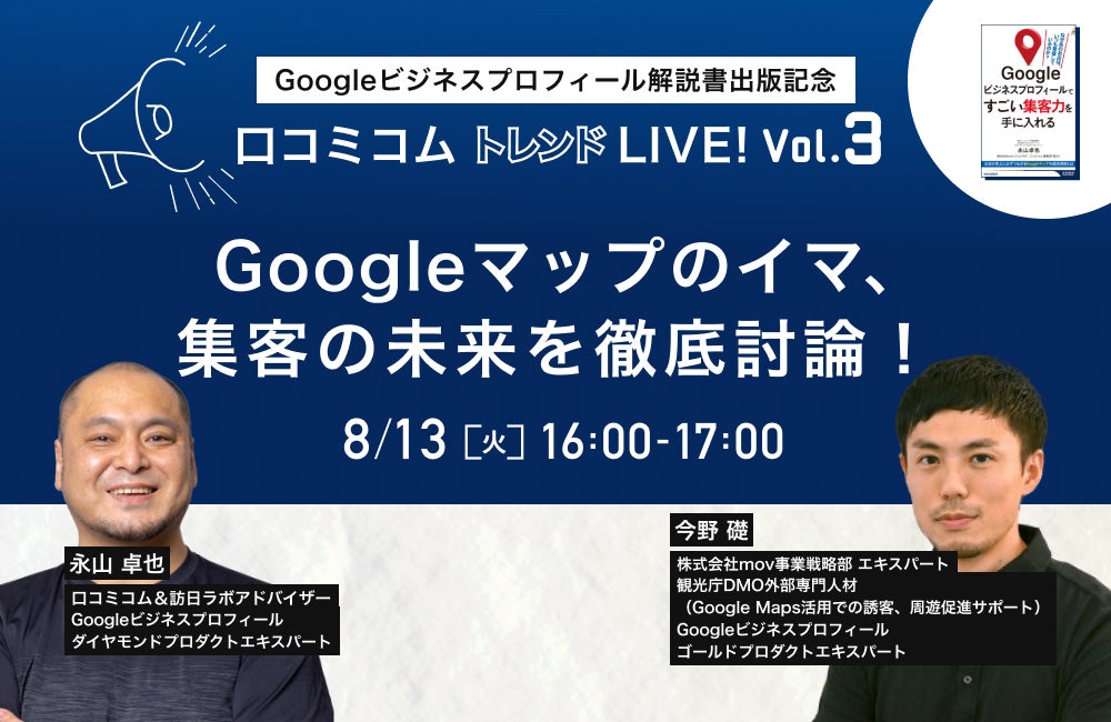 書籍の出版を記念し、今回の「口コミコム トレンドLIVE!」では永山氏とともに株式会社movの今野が登壇します。Googleプロダクトエキスパート同士の対談では、
