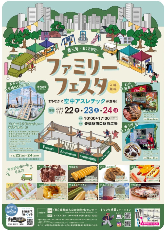 出張版空中アスレチック「フォレストアドベンチャー・モバイルコース」の体験会を東三河の玄関口である豊橋駅前で初開催します。また、奥三河の味覚「鳳来牛」などが味わえるキッチンカーも出店し、小さなお子様から大人まで家族連れで楽しめる企画を3日間連続開催します。