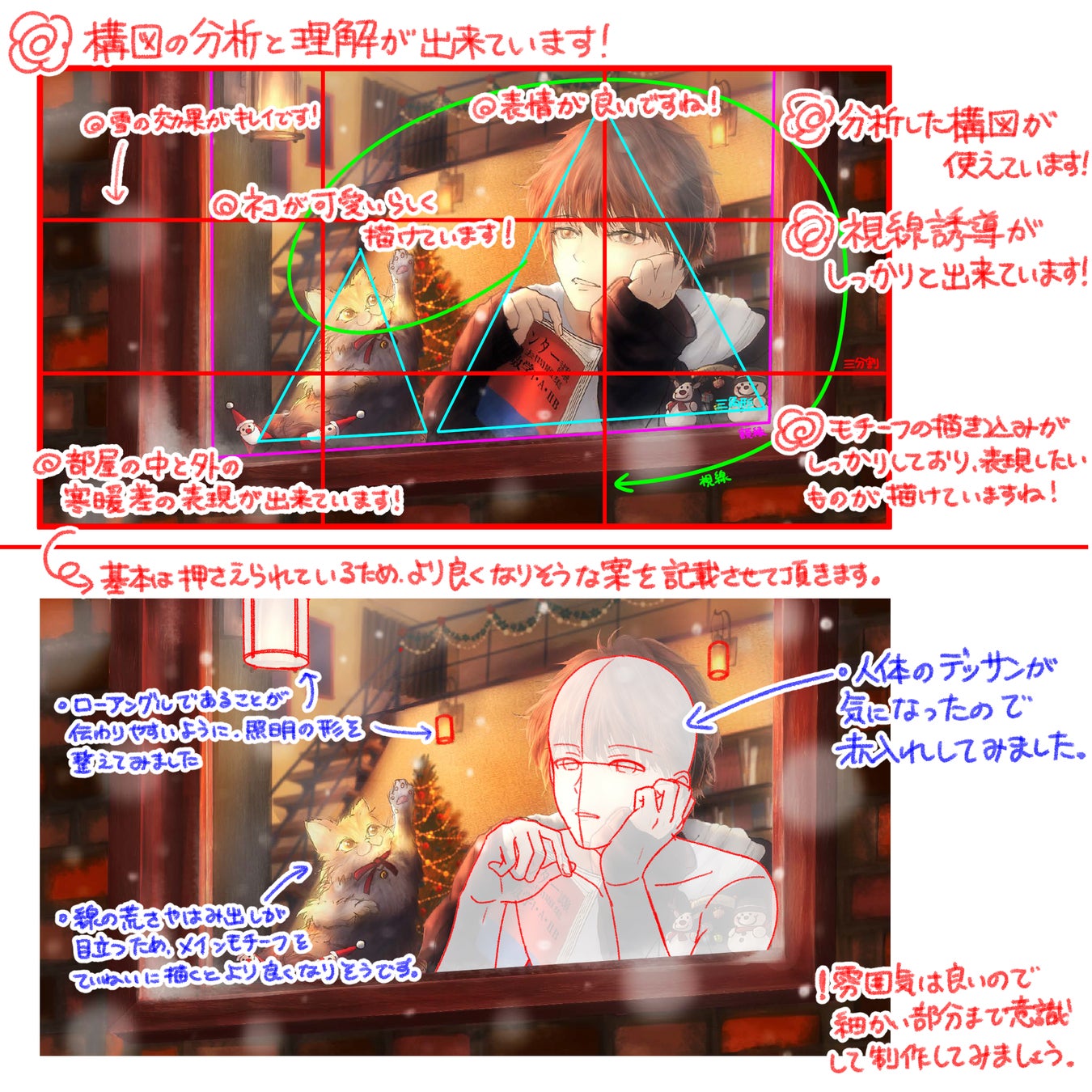 講師陣からの提出作品、課題への個別添削の一例。良い点と改善点などがきめ細かく書き込まれている。