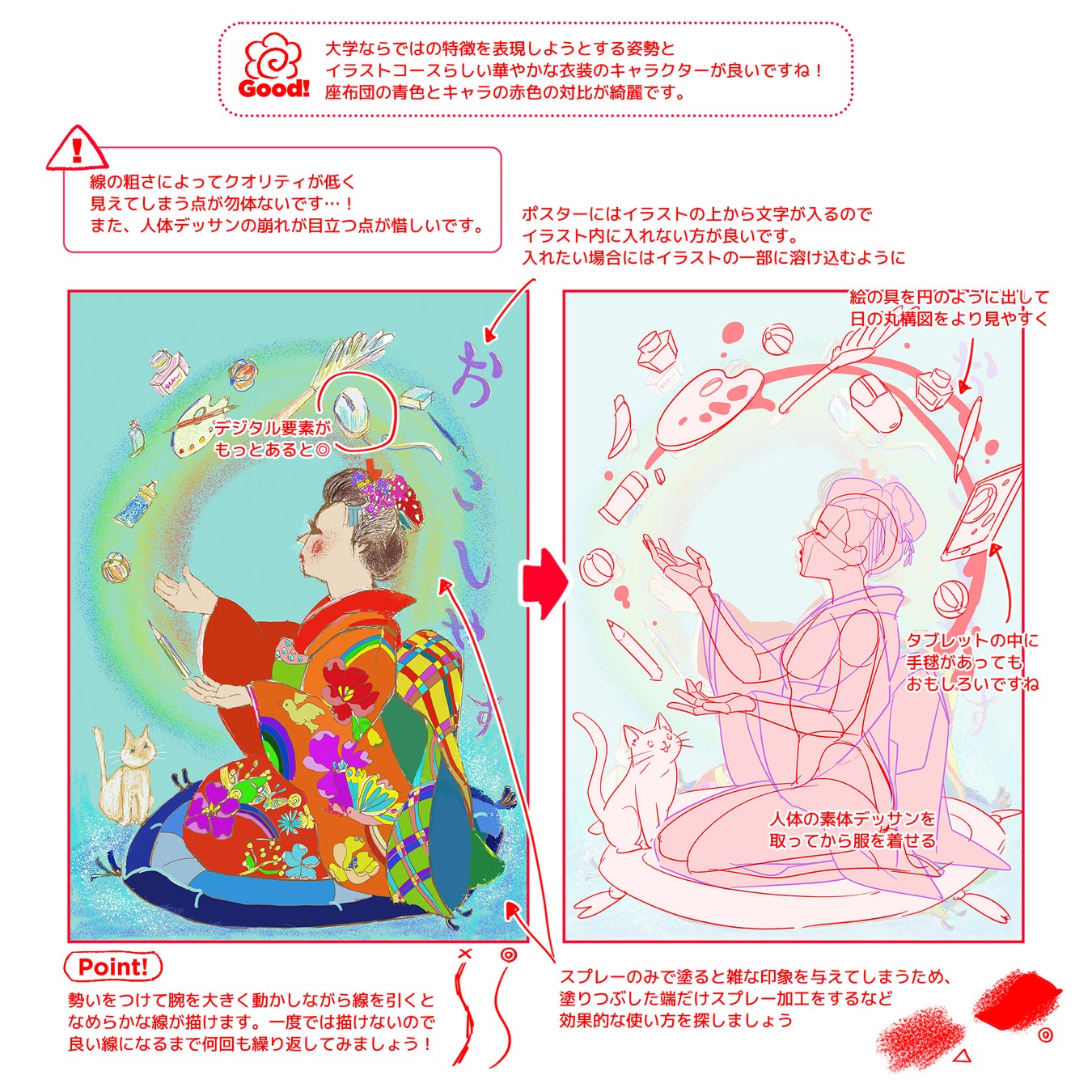 特別な人が学ぶものだと思っていたイラストレーションでしたが、やりたいことをやろうと決めて初心者からスタートしました。美術解剖学、アニメーション、業界知識の授業では著作権やビジネスとして用いられるイラストについて、自分では学べない多岐にわたるジャンルの知識を習得できたと思います。客観的なルールを知り細かいアドバイスを受けて、伝えるためのイラストが生み出せるようになりました。