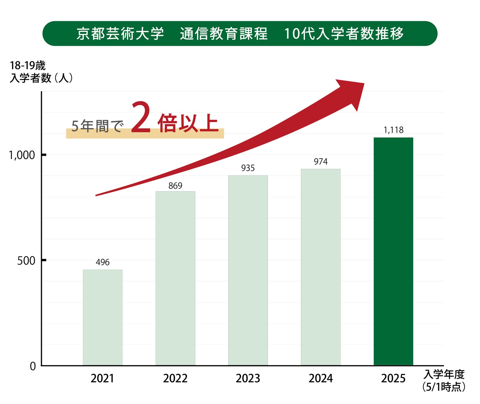 国内最大級の総合芸術大学・京都芸術大学の通信教育課程(在籍数:約18,000人)では、10代の入学者がこの5年で2.3倍に急増。