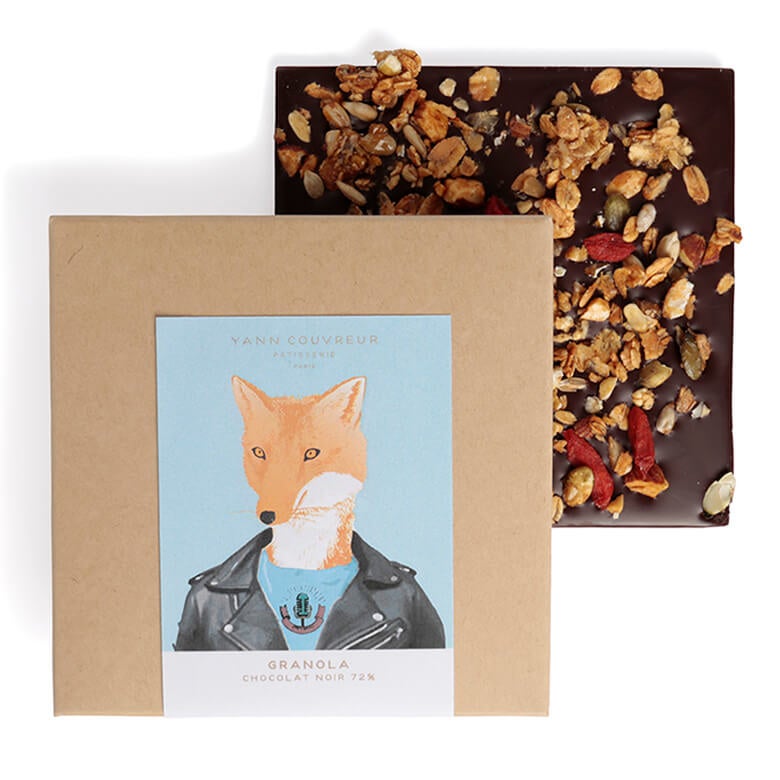 トレードマークのキツネが印象的なパッケージのヤン・クヴルーのタブレット。チョコレートにグラノーラやナッツなどをたっぷりとちりばめ、カカオの力強い風味が広がり、甘すぎないビターなチョコレートです。
