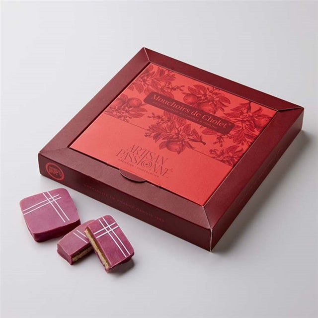 パティシエとショコラティエの2人がつくる、色鮮やかな赤い「ムシュワールダショレ」は、2人の地元の特産品である織物でつくられた赤いハンカチがモチーフにしたショコラです。プラリネから自身で飴がけを行い丁寧につくられます。