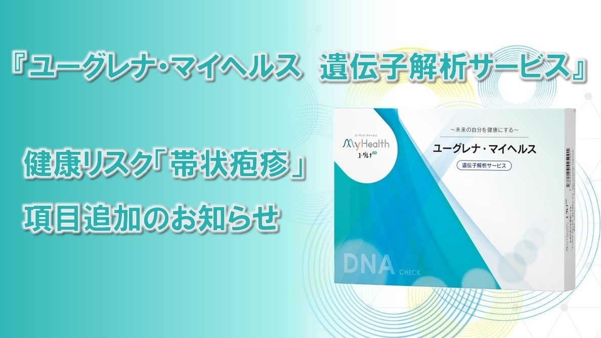 株式会社ユーグレナ(本社:東京都港区、代表取締役社長:出雲充、以下「ユーグレナ社」)は、株式会社ジーンクエスト(以下「ジーンクエスト社」)とともに、ユーグレナ社が提供する『ユーグレナ・マイヘルス 遺伝子解析サービス』、およびジーンクエスト社が提供する遺伝子検査サービス『ジーンクエスト ALL』において、2024年8月、遺伝子解析項目に健康リスク「帯状疱疹」を追加したことをお知らせします。