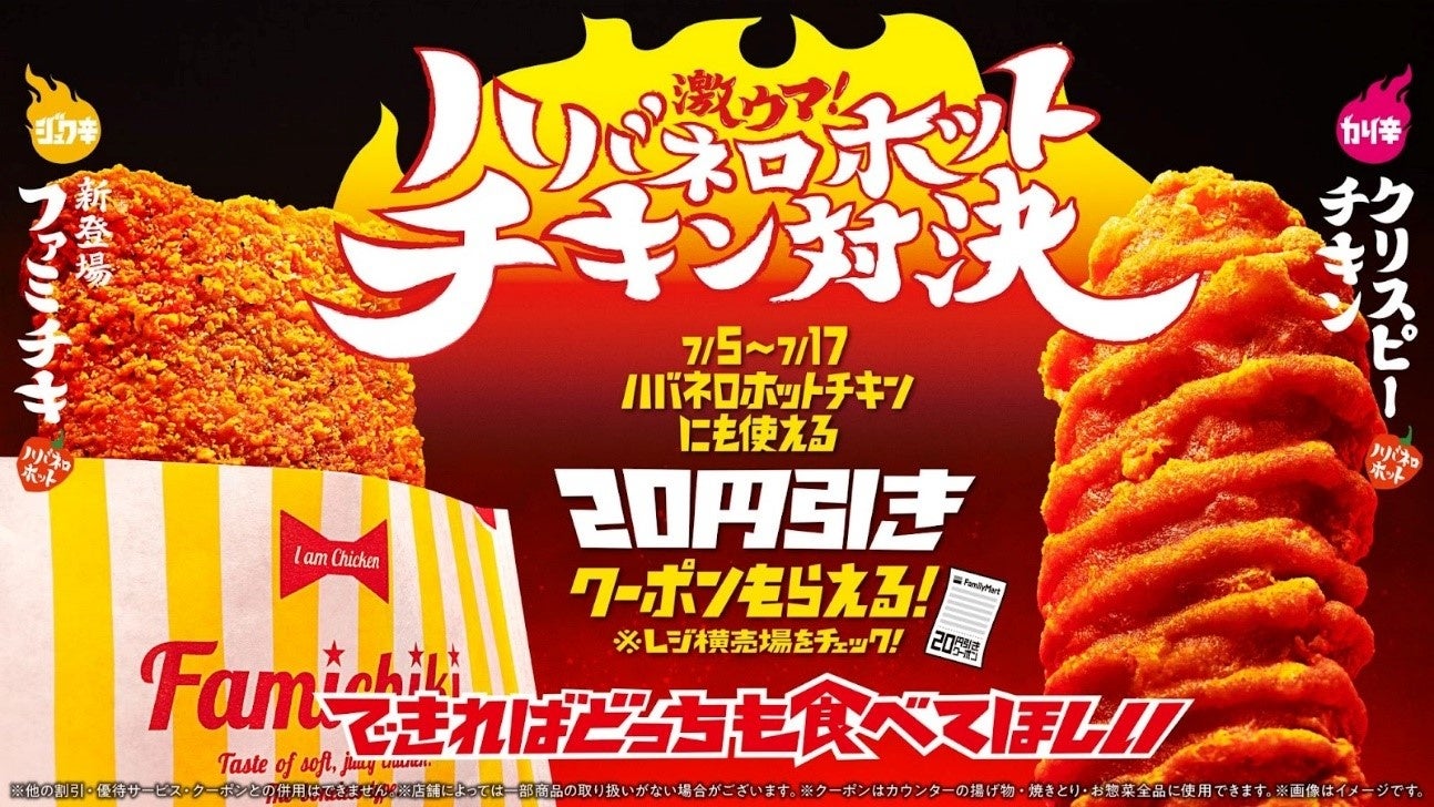 株式会社ファミリーマート(本社:東京都港区、代表取締役社長:細見研介)は、昨年から取り組んでいる5つのキーワードの「もっと美味しく」、「たのしいおトク」の一環として、2022年7月5日(火)より、看板商品「ファミチキ」の新フレーバー「ファミチキ(ハバネロホット)」180円(税込198円)を全国のファミリーマート約16,600店で発売し、「クリスピーチキン(ハバネロホット)」との「激ウマ!ハバネロホットチキン対決」のキャンペーンを実施しております。