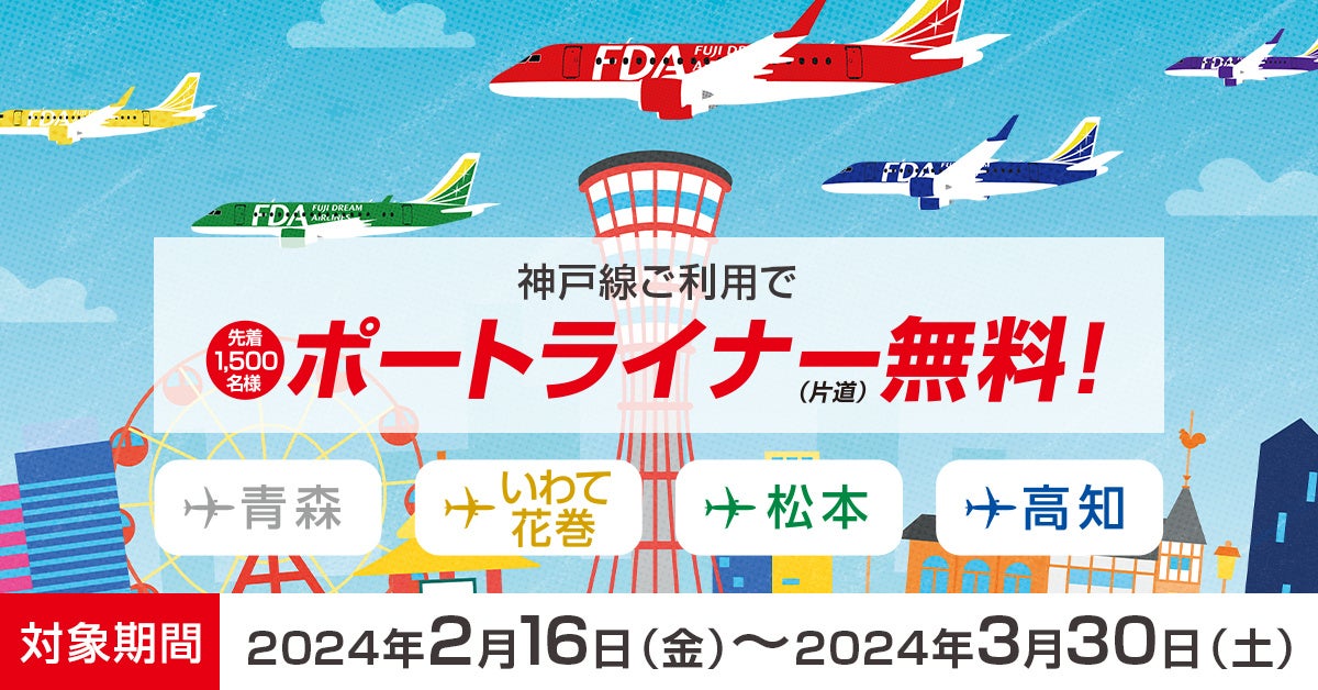 株式会社フジドリームエアラインズ(略称:FDA、本社:静岡県静岡市、代表取締役社長:楠瀬 俊一)は、神戸空港行きの各便をご利用いただいたお客さまを対象に、神戸空港と神戸市内を結ぶ「ポートライナー」の片道乗車券をプレゼントするキャンペーンを、2024年2月16日(金)より実施いたします。