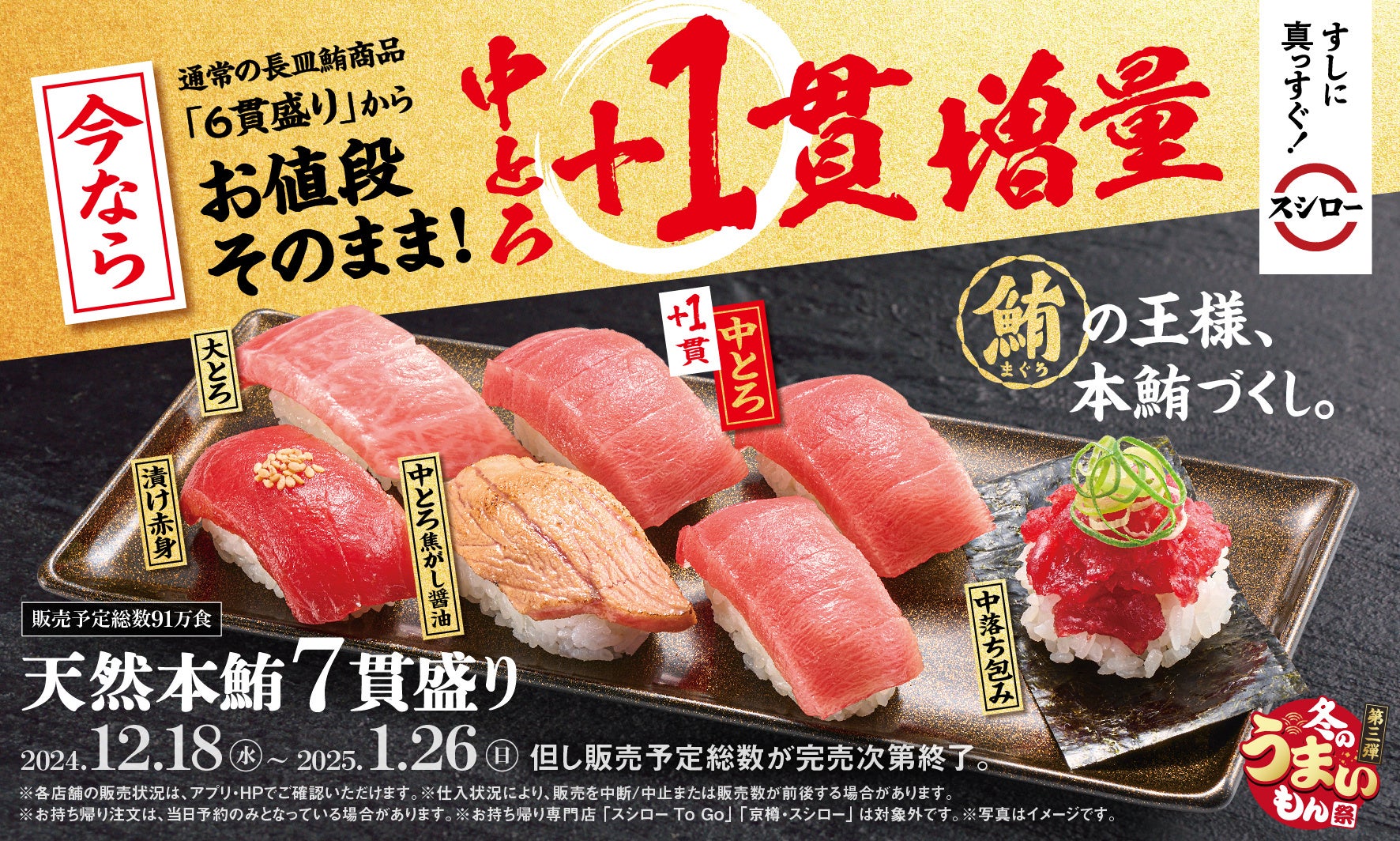 株式会社あきんどスシロー(本社:大阪府吹田市、代表取締役社長:新居 耕平)は、一年の感謝を込めて、通常の長皿鮪商品「6貫盛り」から中とろが1貫プラスでお楽しみいただける天然本鮪の盛り合わせに加えて、“豪華ネタ”や“大切りネタ”が登場する『冬のうまいもん祭 第三弾』を12月18日(水)より全国のスシローにて開催いたします。