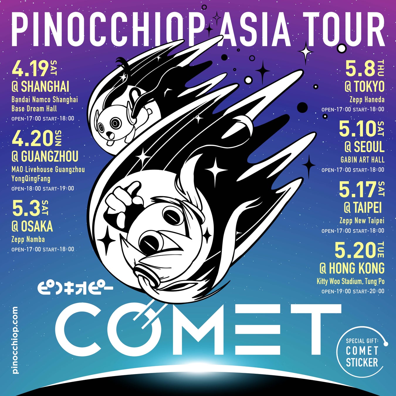 ピノキオピー初のアジアツアー「ピノキオピー ASIA TOUR "COMET"」(大阪/東京公演主催:株式会社HIKE、上海/広州公演主催:天津凌创文化发展有限公司、ソウル/台北公演主催:サイバーステップ株式会社、香港公演主催:LIVE NATION)の開催地として上海、広州、大阪、東京に加え、ソウル、台北、香港での開催が決定いたしました。また、上海公演、広州公演のチケットが完売となりましたこともあわせてお知らせいたします。大阪公演、東京公演は明日3月26日(水)までプレイガイド独占先行(抽選)を受付中です。
