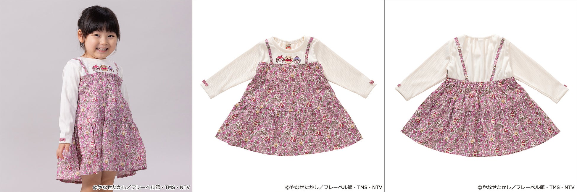 胸元はアンパンマン、ドキンちゃん、コキンちゃんの刺繍が施されています。総柄部分はアンパンマン、ドキンちゃん、コキンちゃん、あかちゃんまん、メロンパンナちゃん、ロールパンナたちがお花に隠れたデザインです。袖口のリボンもポイントになっています。