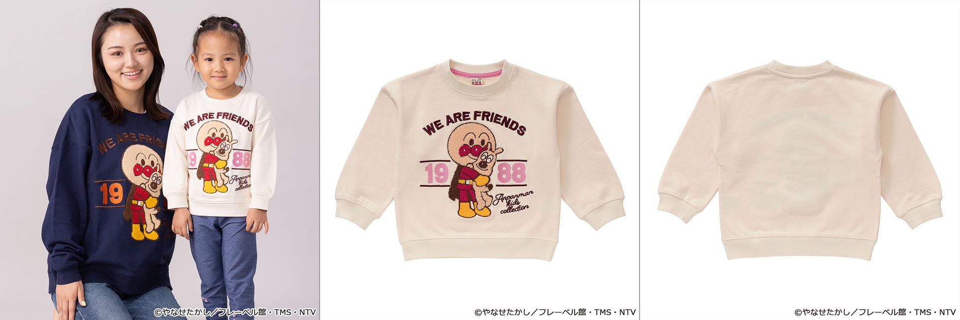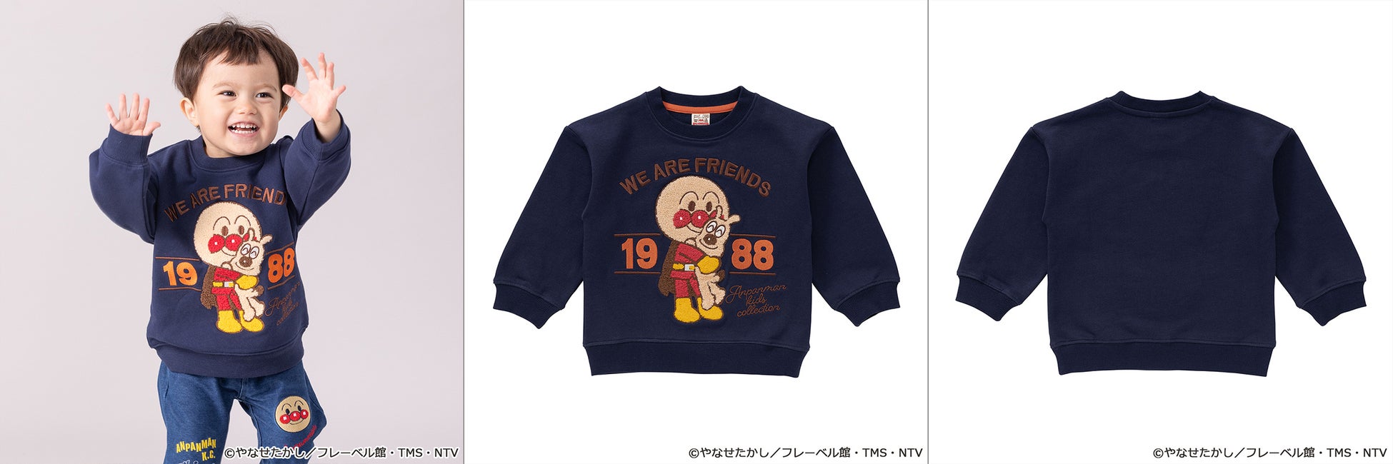 ハグしているアンパンマンとめいけんチーズが、さがら刺繍で立体的に表現された可愛いトレーナーです。数字やロゴは刺繍でデザインされています。大人サイズの展開もあるので、親子でペアコーディネートを楽しめます。