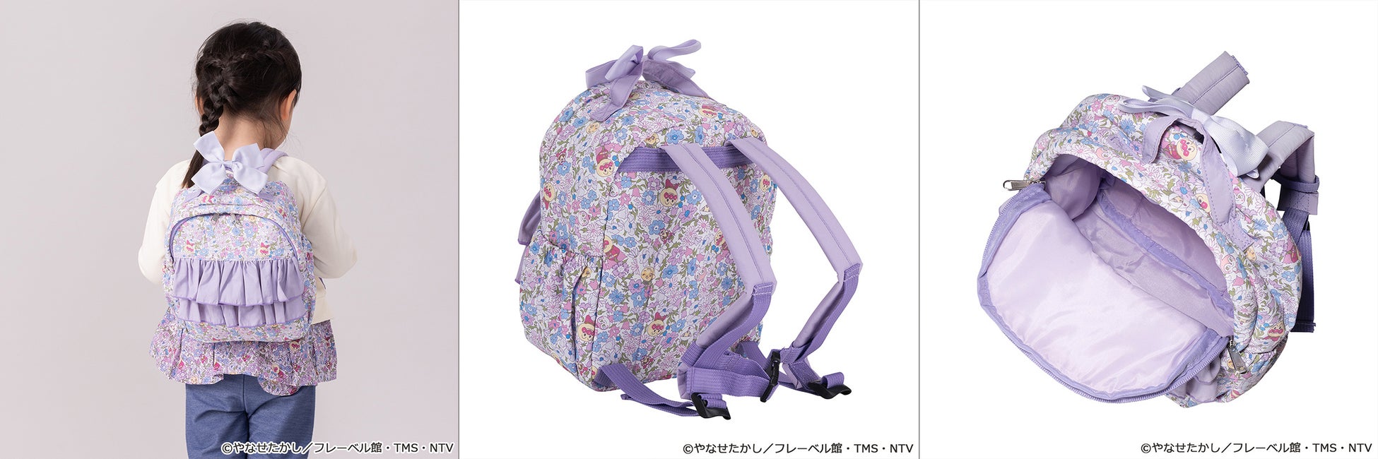 アンパンマン、ドキンちゃん、コキンちゃん、あかちゃんまん、メロンパンナちゃん、ロールパンナたちがお花に隠れた総柄デザインの6Lサイズのリュックです。