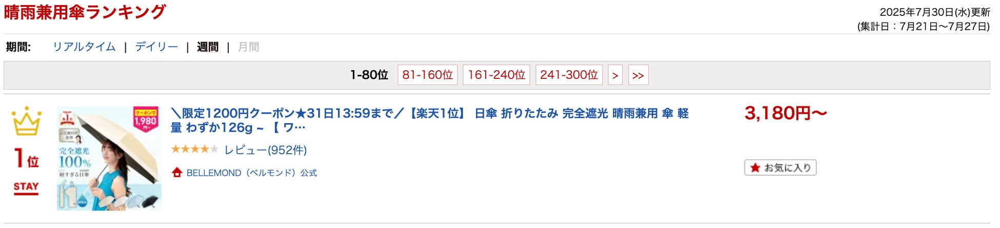 【57%OFF!超軽量だから持ち歩きも苦じゃない】8月1日〜タイムセール開催。完全遮光&UVカット率100%&カテゴリランキング1位獲得の超軽量晴雨兼用折りたたみ日傘「晴雫(はれしずく)」楽天市場