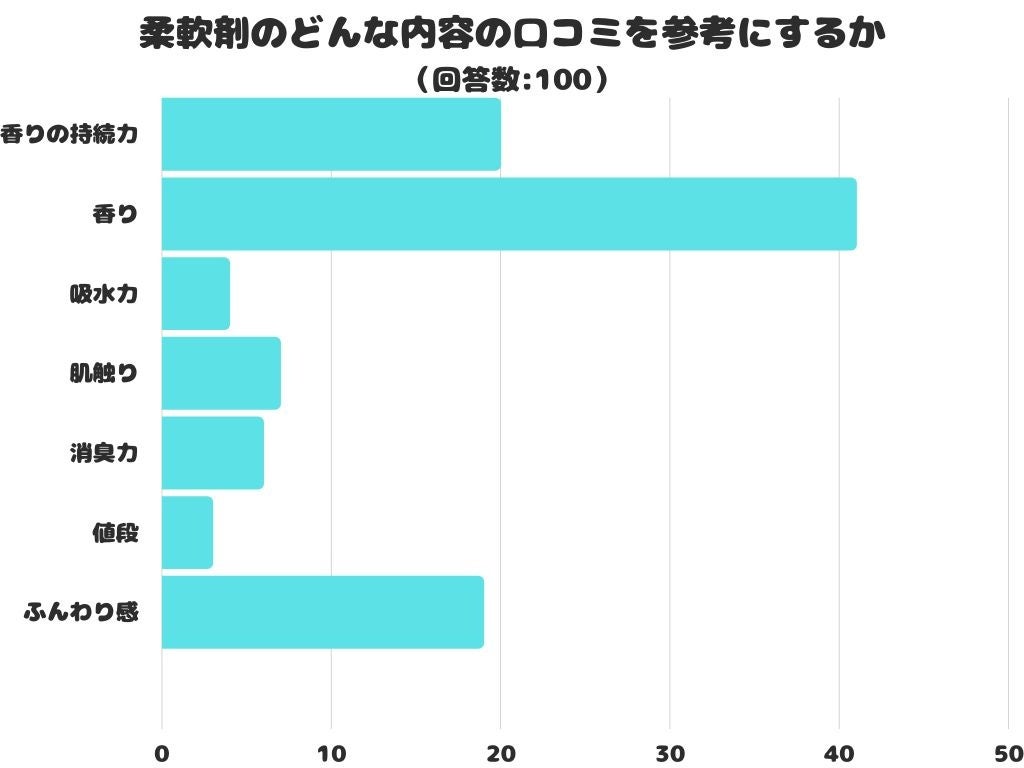 柔軟剤のどんな内容の口コミを参考にするかをアンケートにて調査したところ、1位は「香り」でした。