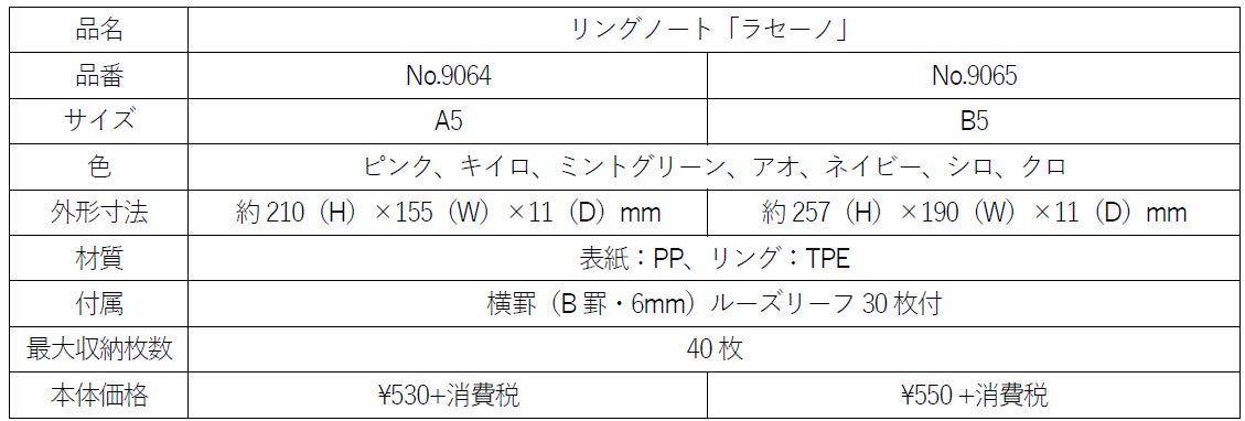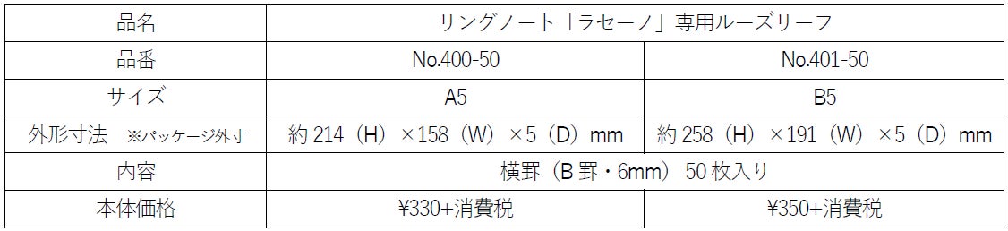 リングノート「ラセーノ」専用ルーズリーフ製品仕様