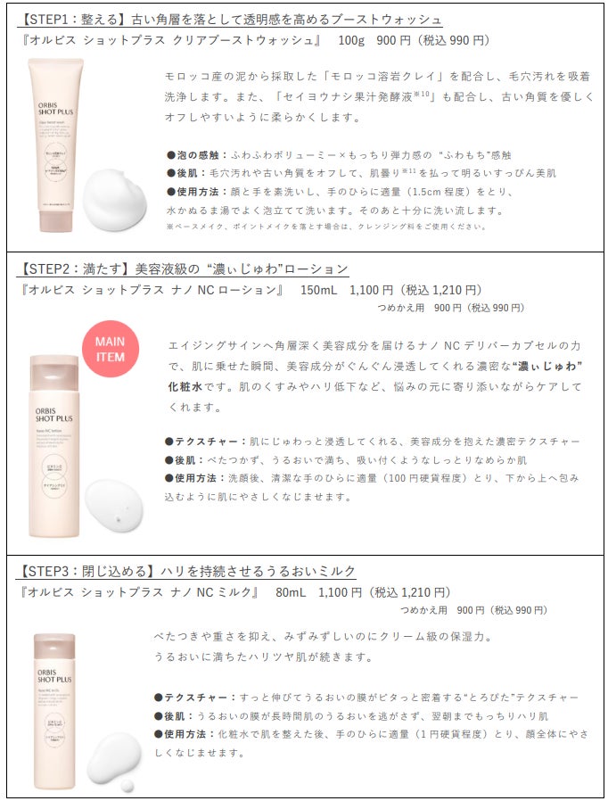 シリーズ名の「ORBIS SHOT PLUS(オルビス ショットプラス)」には、肌に必要な保湿成分を届ける力 (=SHOT)、そしてオルビスが培ってきた、ビューティの可能性を信じ「美しくなりたい」という想いに寄り添い、その先の肌の美しさまでも約束していく(=PLUS)、という想いを込めています。そして今回、ポーラ化成工業の 90 年の化粧品開発研究から得た、エイジングケア知見を結集。美容成分を早く・角層深く届けることで、気になる乾燥・ハリ・くすみなど、年を重ねるごとに気になるエイジングサインを狙い撃つ高浸透エイジングケアシリーズです。