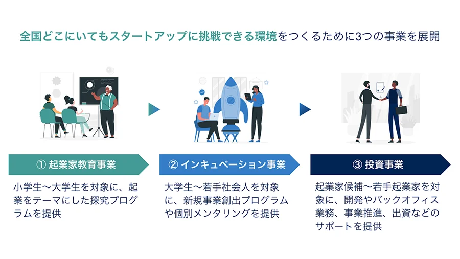 ガイアックスのスタートアップスタジオでは「全国どこにいてもスタートアップスタジオに挑戦できる環境」をつくるために、産学官で連携しながら、①起業家教育事業、②インキュベーション事業、そして③投資事業の3つの事業を提供しています。