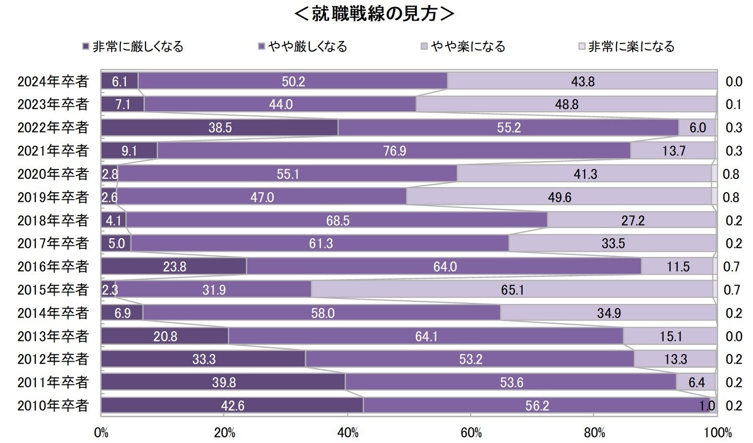○先輩たちより「厳しくなる」56.3%。前年調査に比べ約5ポイント増加
