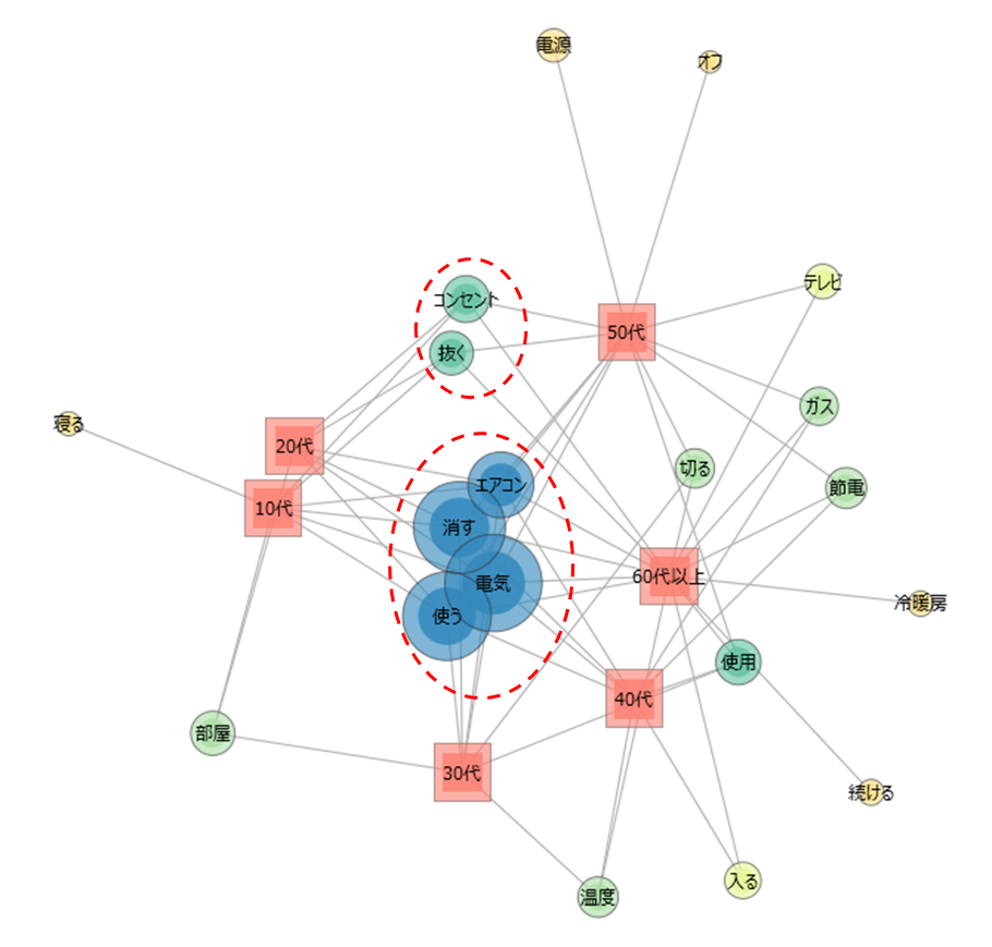 性別でみると、男女ともに電気の使用、エアコン、コンセント、ガスというキーワードが挙げられている。女性は男性に比べて料理やシャワーなどでの節電・節ガスを想起している。