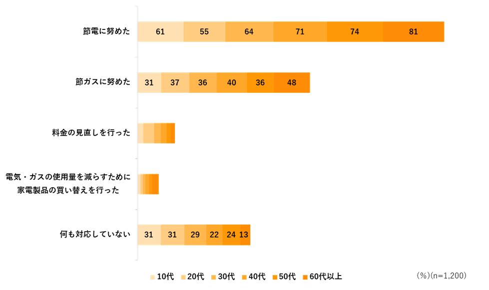 値上がり傾向にある電気とガス料金に対し、自宅でどのような対応を行ったか聴取した。年代別では60代以上の81%が「節電に努めた」と回答しており、他の年代より高い。また、全ての年代で節電を実施している人が5割を超え、「何も対応していない」を大きく上回った。