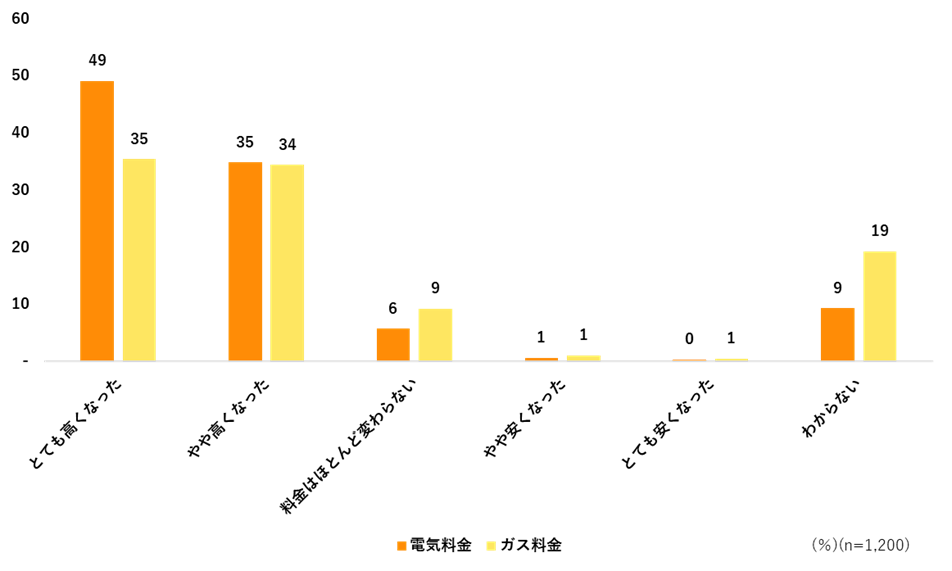 「料金が高くなった」と回答した人は電気代で84%、ガス代で69%