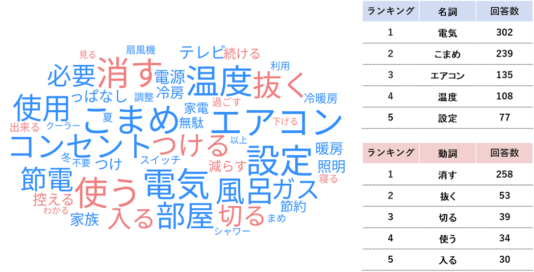 心掛けたい節電・節ガス方法を自由回答で聴取し、回答内容をテキストマイニングした。大きく表示されている出現頻度の高い単語を見ると、名詞では「電気」「エアコン」「温度」など、動詞では「消す」「抜く」「切る」などのキーワードが目立つ。電気をこまめに消す、エアコンの温度設定を下げるという節電・節ガス方法に取り組みたいという意向がうかがえる。