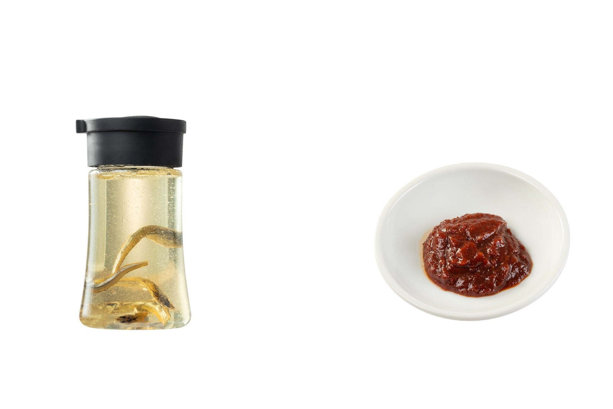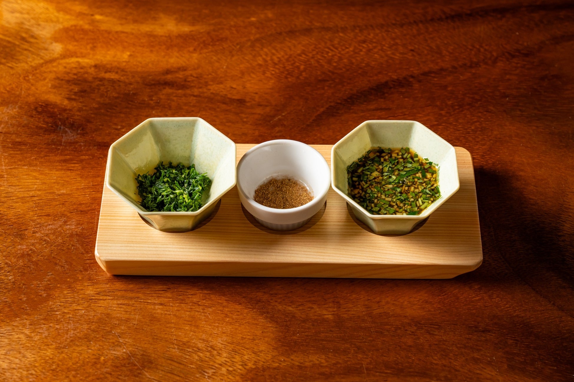 〆には「脂そば」をご用意しました。(1人前880円)濃厚スープと和えた麺にさっぱりとした旨味の特製煮干酢やピリ辛ダレを添えて出汁の旨味を一滴残らずお召し上がりください。
