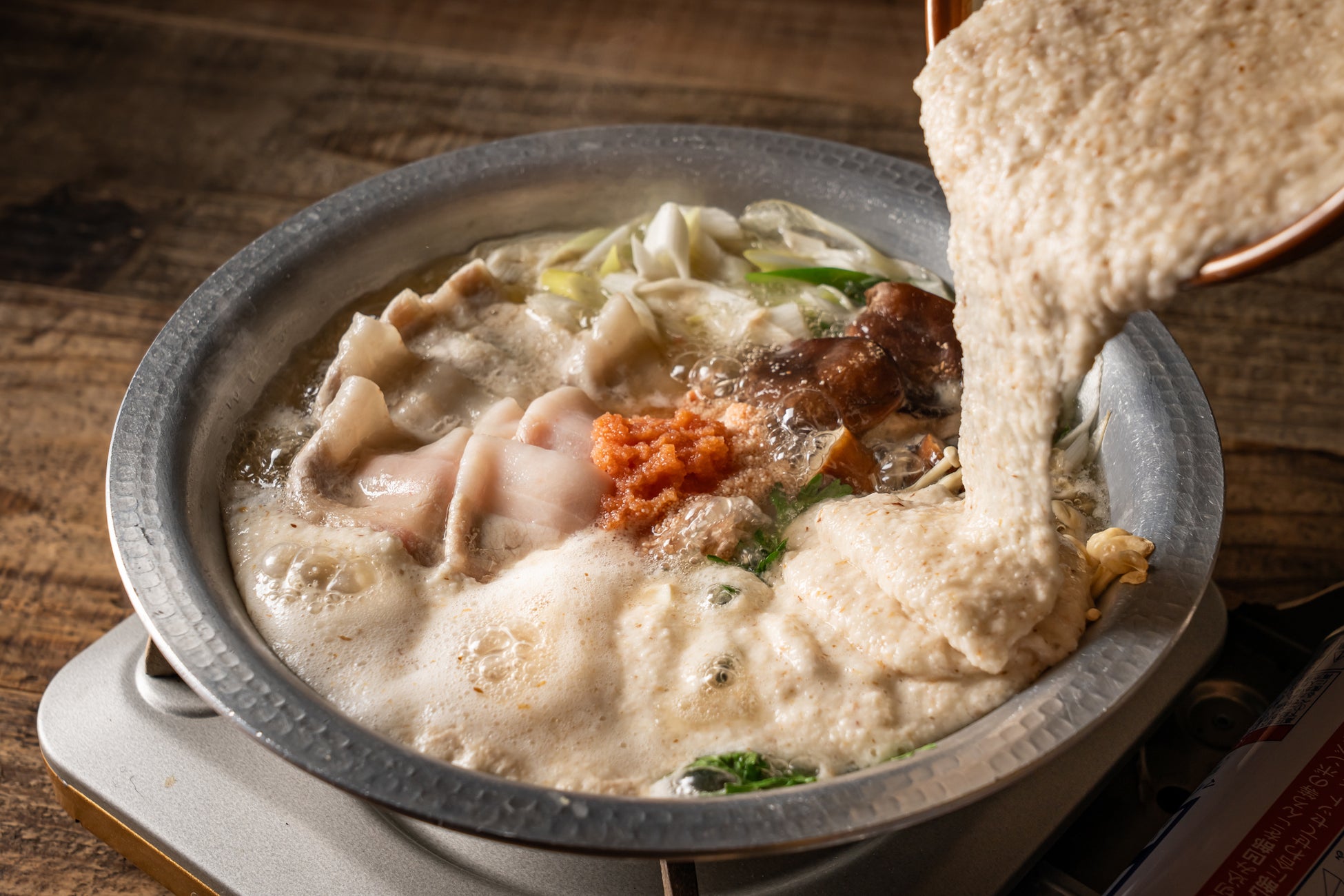 福岡県・糸島のあご出汁と鹿児島県産の淡口醤油をベースにした優しい味わいのスープに九州産の野菜(加藤えのき・栗原ネギ・大杉椎茸・大葉春菊)をたっぷり加え、ふわふわのとろろと福岡県糸島産の明太子で仕上げる具沢山ふわとろ鍋。