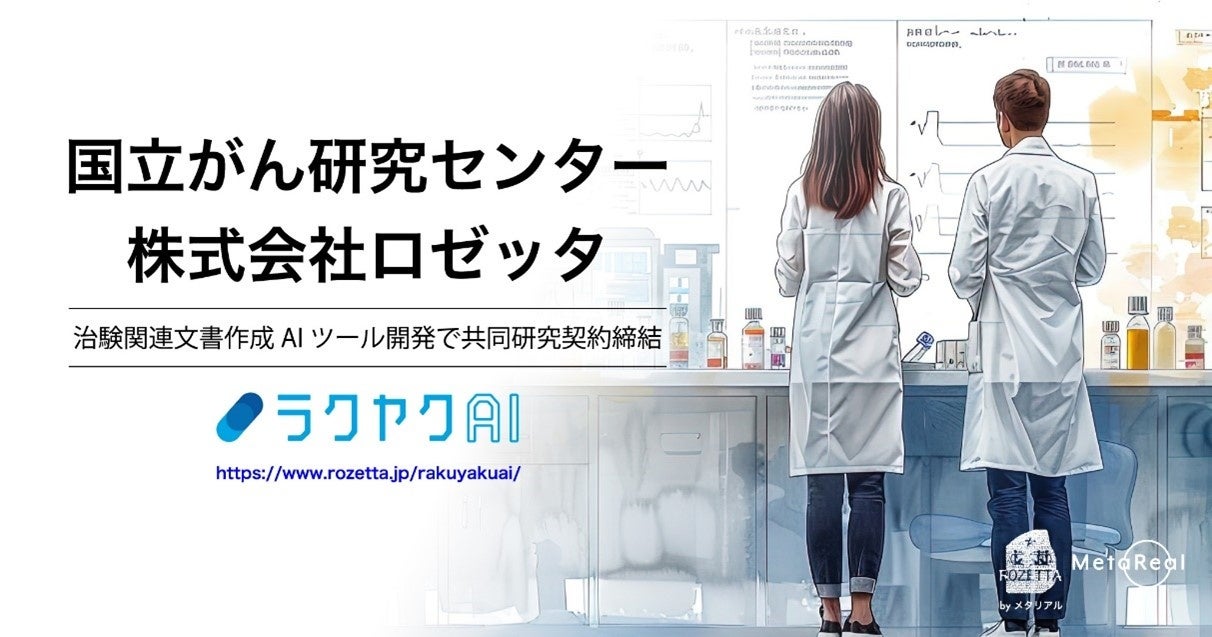 株式会社メタリアル(本社:東京都千代田区、代表取締役:五石 順一)グループでAIサービスの開 発・運営行う株式会社ロゼッタ(代表取締役:渡邊 麻呂)は、国立研究開発法人国立がん研究センタ ー (東京都中央区、理事長:中釜 斉)と CSR(総括報告書)をはじめとする治験関連文書作成の自動 化に関する生成AIの開発に取り組む共同研究契約を締結しました。