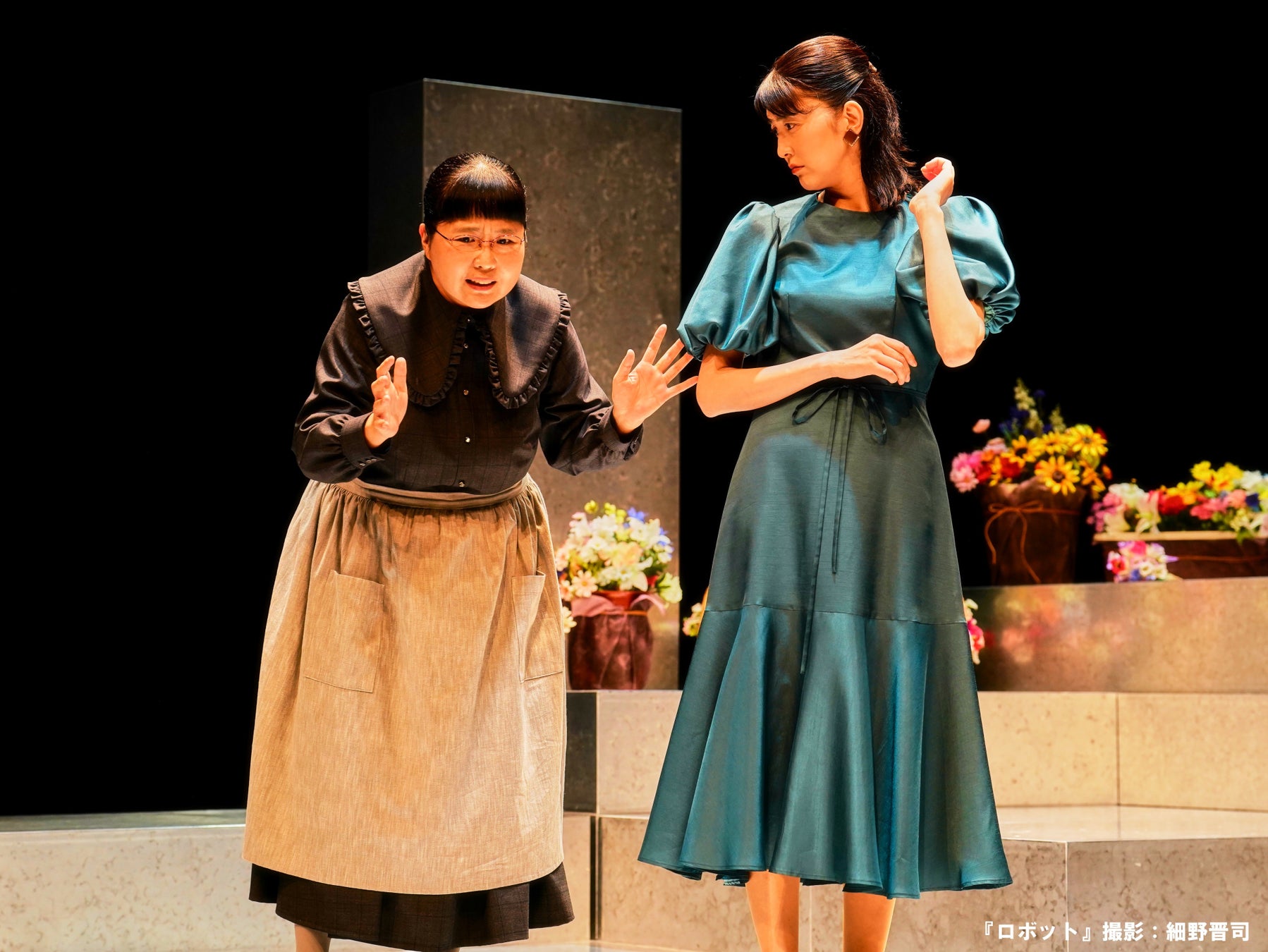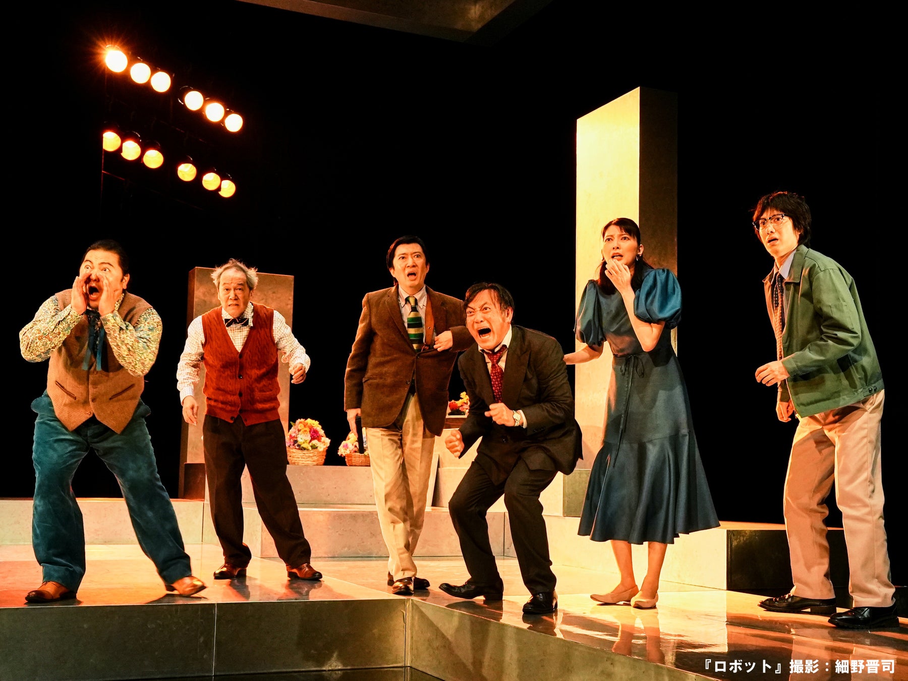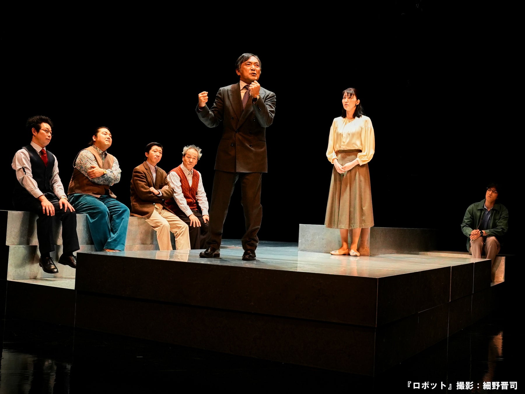 今作の戯曲は約100年前の1920年に、チェコの国民的作家・劇作家であるカレル・チャペックによって発表されたもの。チャペックは「労働」を意味するチェコ語「robota(ロボタ)」から「ロボット」という言葉を新たに生み出したと言われている。今回の上演では栗栖茜による翻訳戯曲を元に、独特の奇想天外な世界観を描き出す作風に定評のあるノゾエ征爾が、ロボットと人間の共存が始まりつつある2024年に生きる人々に向けて、シニカルかつ不条理なドラマとして転換し、現代の物語として上演された。