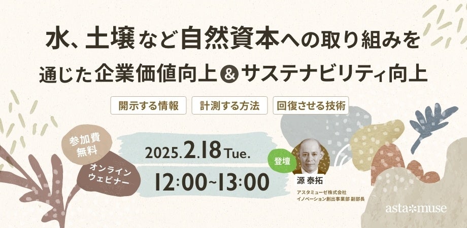 アスタミューゼ株式会社(本社:東京都千代田区、代表取締役社長 永井歩)は、2025年2月18日(火)12:00-13:00に、業界を問わず、サステナビリティに関する業務を担当している方、興味をお持ちの方を対象とした無料ウェビナー「水、土壌など自然資本への取り組みを通じた企業価値向上&サステナビリティ向上 ~開示する情報・計測する方法・回復させる技術~」を開催いたします。