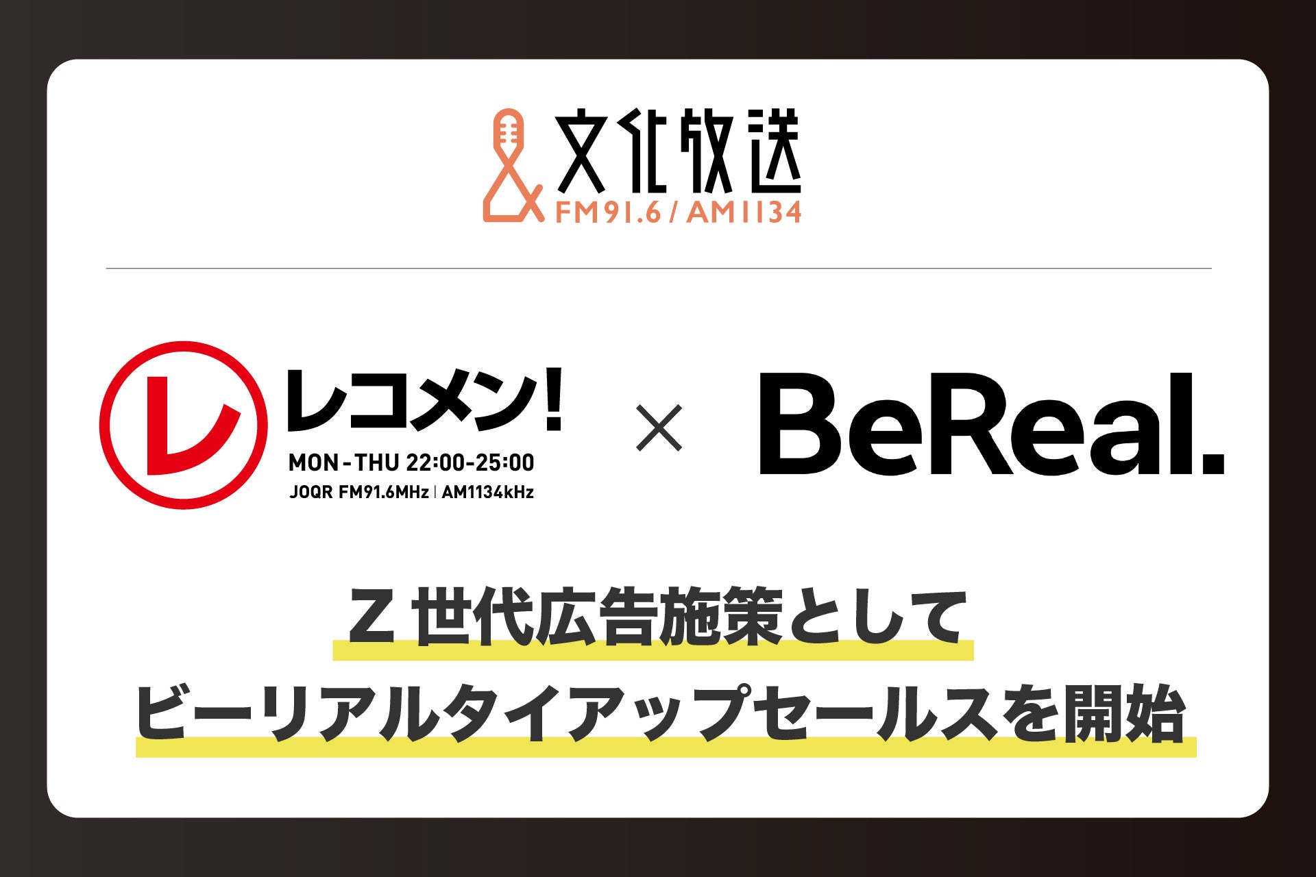 文化放送、Z世代にリーチできる新しい広告プランを発表 —人気ラジオ番組『レコメン!』と写真共有アプリ「BeReal.」を組み合わせた新広告プランを提供開始—