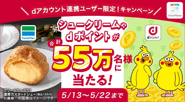 上記のプログラムと同時に、SmartNewsとSmartNews for docomoで、dアカウントにログインして参加できる抽選企画を5月22日まで実施します。ユーザーはdアカウントでログイン後、クーポンチャンネルから抽選に参加できます。ファミリーマートの定番スイーツ「クリームたっぷり!濃厚カスタードシュー」の無料引換券か、dポイント5ポイントのいずれかを抽選で提供します。当選者数は、「クリームたっぷり!濃厚カスタードシュー」が5万名様、dポイントが50万名様で、期間中毎日抽選に参加いただけます。
