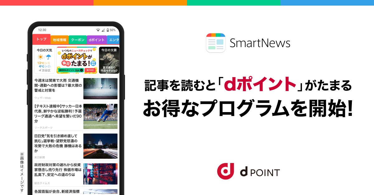 スマートニュースは、本年2月にSmartNewsアプリでドコモ「dアカウント」との連携を開始し、ユーザーがSmartNewsアプリ上でdポイントをより便利に活用いただけるようにしました(※1)。今回、SmartNewsとSmartNews for docomoの両アプリで、dポイントがたまるプログラムを開始し、SmartNewsの利用体験をさらに高めてまいります。