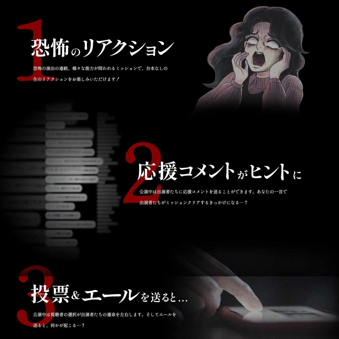 出演者達が恐怖ミッションに挑戦する、約90分の謎解き生配信シリーズ。台本の中身を一切知らされていない出演者たち。そのリアルなリアクションも見どころ。また、配信のインタラクティブ機能を利用し、コメントを通して視聴者と一緒に謎を解明したり、視聴者からのエールによって進行の流れが変化。出演者と視聴者が一体となって楽しめるポイントが盛りだくさん!