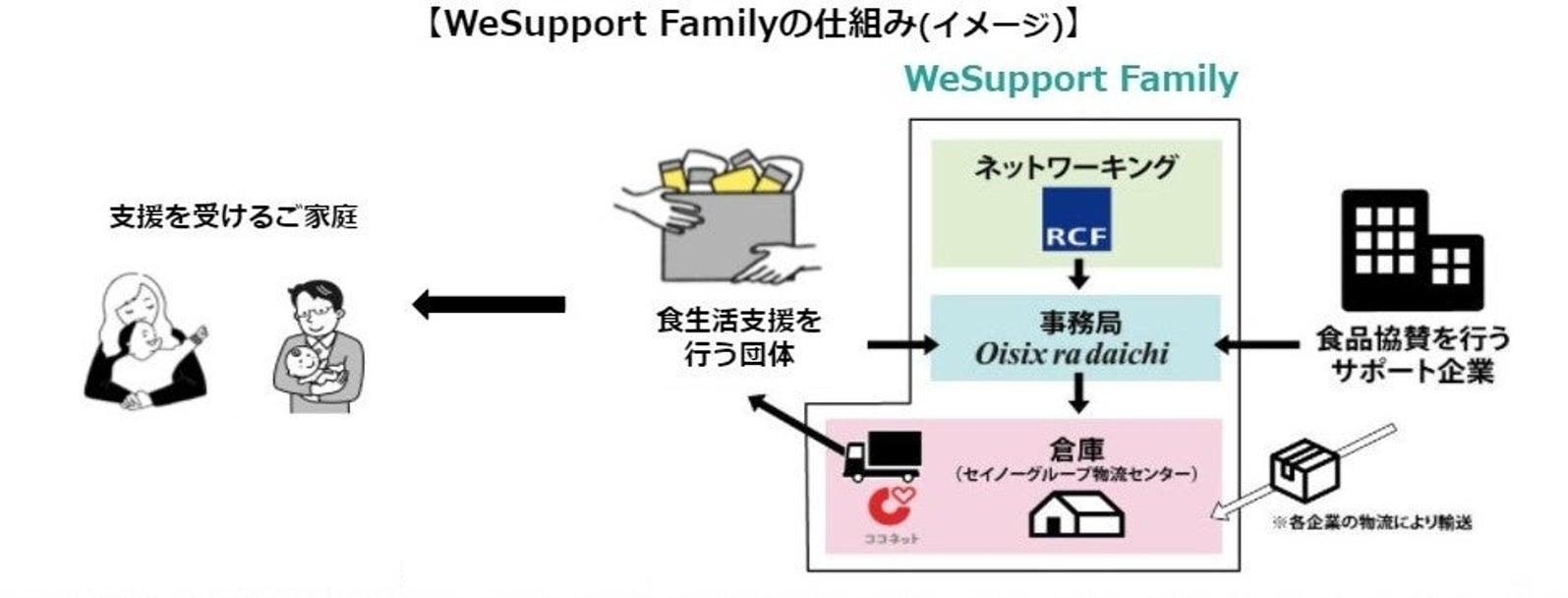 「WeSupport」は、新型コロナウイルス患者の治療にあたる医療従事者に向け、食支援を行うため、2020年4月に設立されました。医療従事者向けの支援の「WeSupport Medical」は2021年11月をもって支援を終了し、このプラットフォームを活用し、ひとり親世帯を中心とした子どものいる困窮家庭に向けた食支援「WeSupport Family」を2021年12月より開始しました一般社団法人RCF、オイシックス・ラ・大地株式会社、ココネット株式会社(セイノーホールディングスグループ)が連携して運営しています。「WeSupport Family」が、食品の寄付にご協力いただけるサポート企業と、支援先の各団体とをマッチングし、各団体が運営するフードパントリーなどを通じて食品支援が行われます。